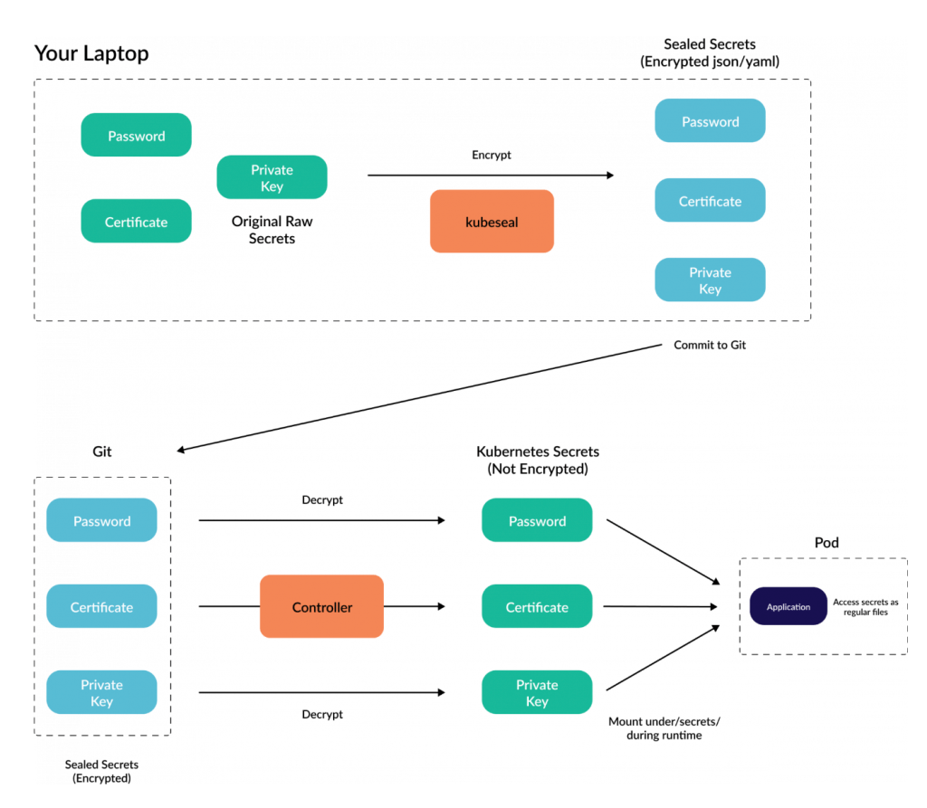Kenyataannya tidak ada jawaban yang 100% benar, semua kembali pada toleransi dan kebijakan suatu perusahaan maupun concern suatu tim dalam proses pengelolaannya. Jika anda sudah memiliki solusi paten mengelola kredensial atau secret menggunakan Hashicorp Vault. Tentu itu sangat masuk akal untuk dilakukan, hanya saja cara tersebut bertentangan dengan praktik GitOps. Namun jika anda baru saja memulai proyek baru, ada cara untuk menyimpan kredensial atau secret pada Git tanpa bertentangan dengan praktik GitOps. Hal ini bukan berarti suatu larangan bagi anda untuk melalukan proses commit raw secret, ya 😀 Semuanya kembali pada kalimat pertama paragraf ini :p Salah satu solusinya adalah menggunakan Bitnami Sealed Secrets Controller untuk mengenkripsi secret sebelum menyimpannya pada Git. Alur proses dari hulu ke hilir jika menggunakan Sealed Secrets: