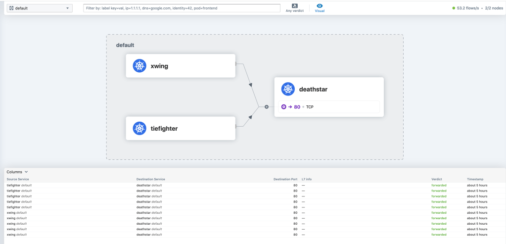 Dari perspektif service deathstar, hanya service dengan label org=emipre yang diizinkan untuk terkoneksi dan mendapatkan respon “Ship landed” kita menerima request.