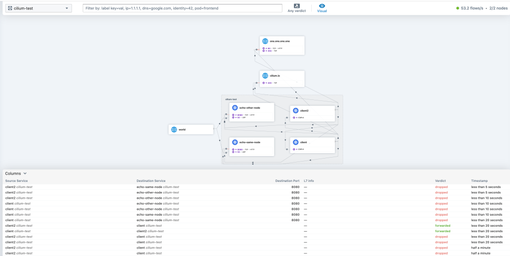 Untuk mendapatkan variasi visualisasi, Anda bisa menjalankan perintah yang menjalankan proses pengujian konektivitas Cilium.